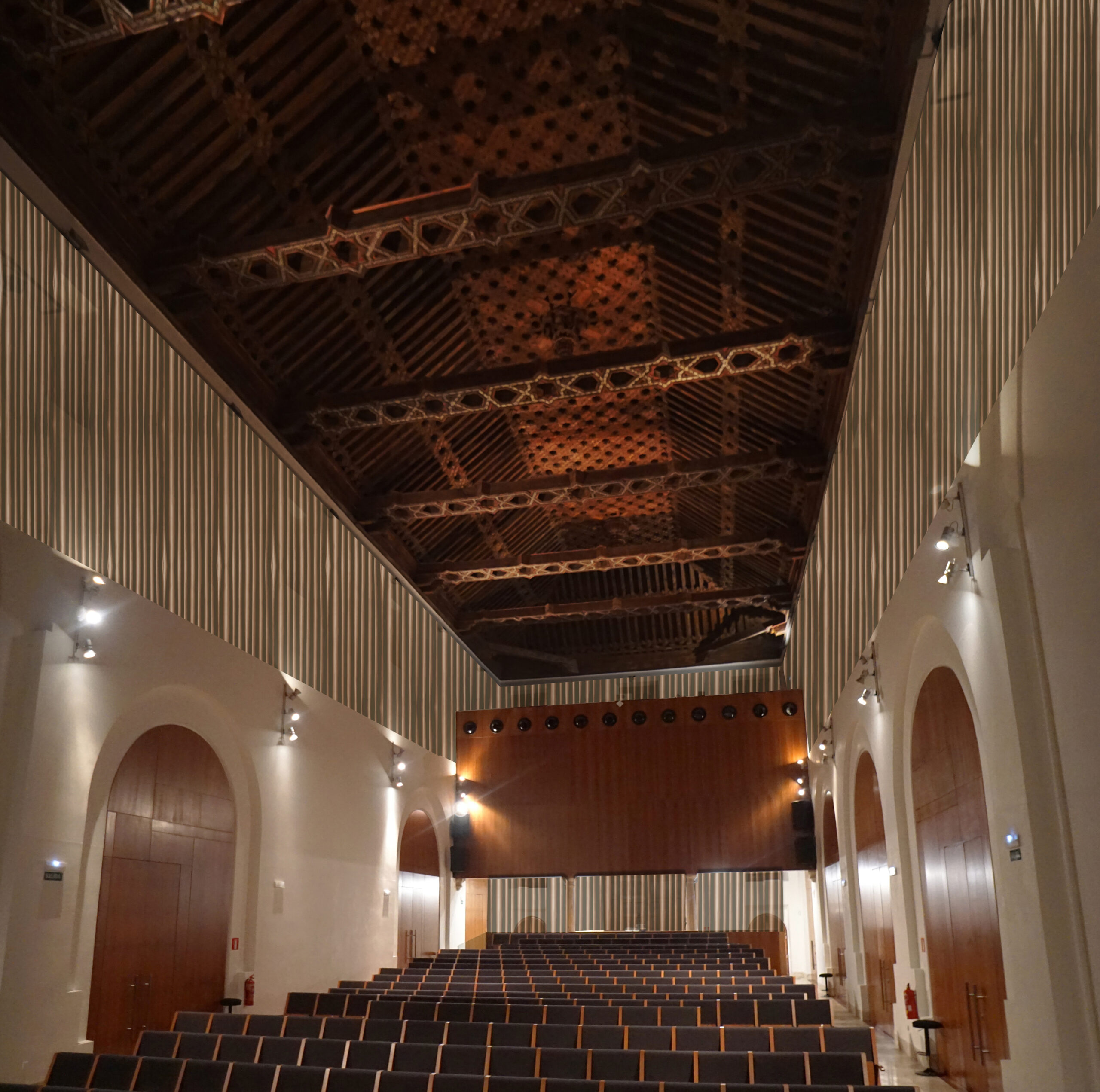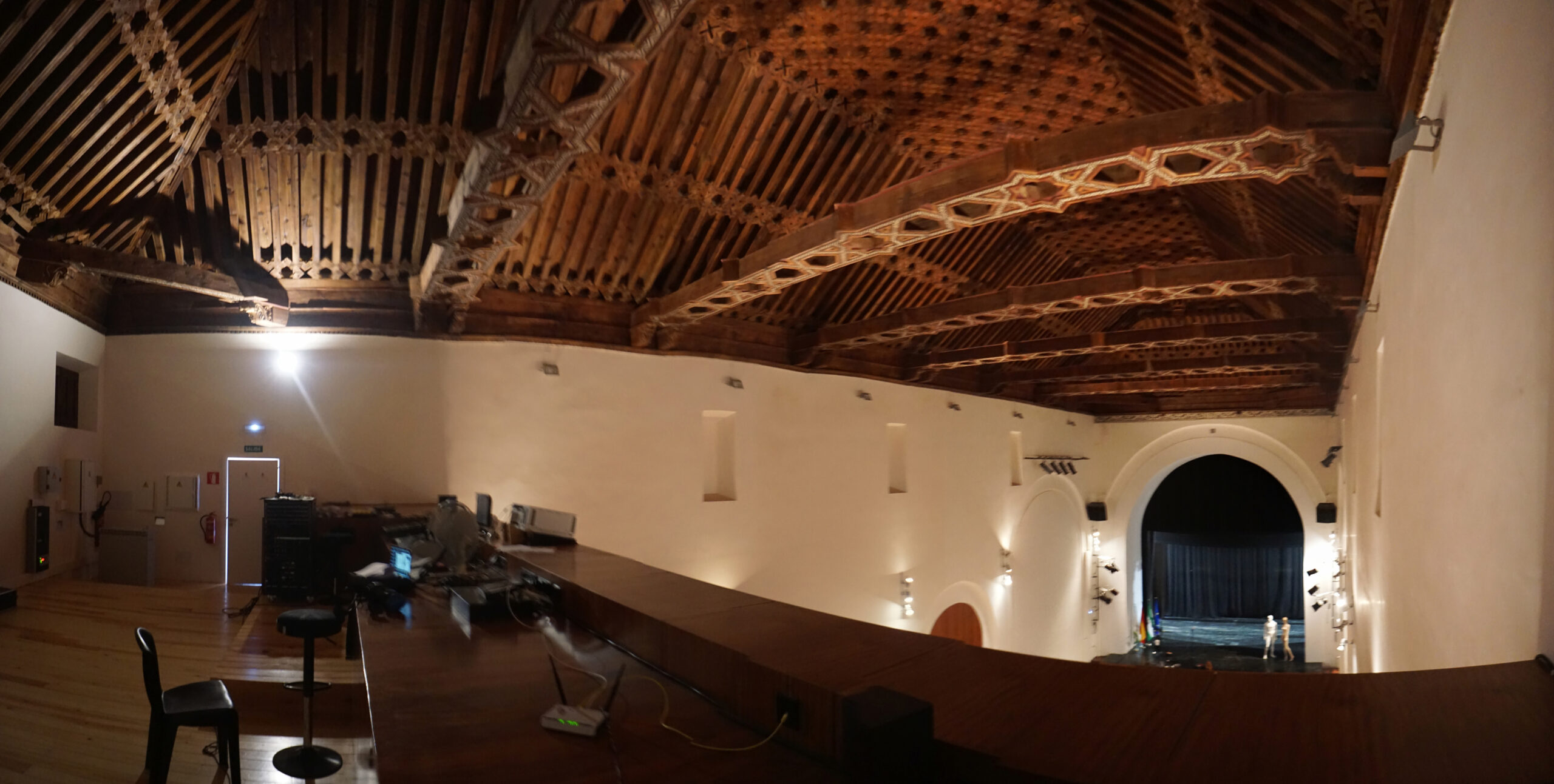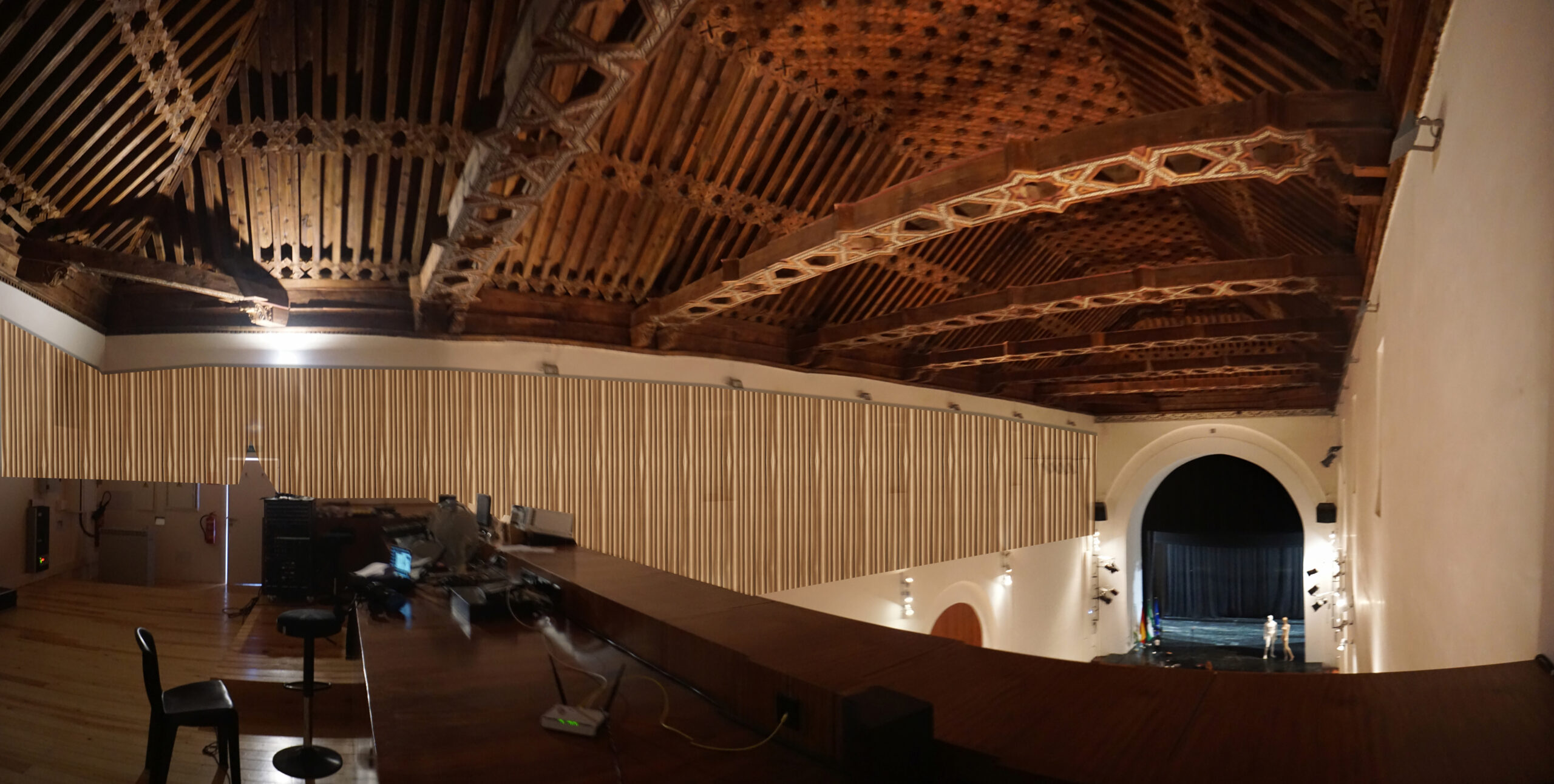 En la sala principal, objeto de este estudio acústico, se encuentra una de las joyas más importantes de Huescar, un artesonado mudéjar que cubre lo que es el actual patio de butacas. Datado de mediados del s. XVI, se ha conseguido mantener como en su origen.